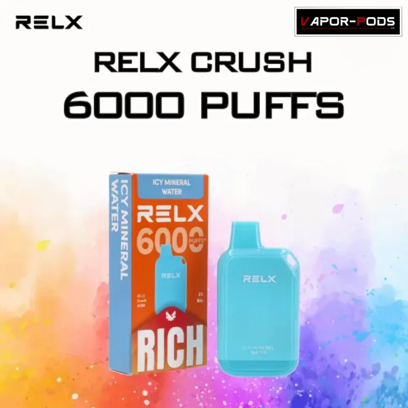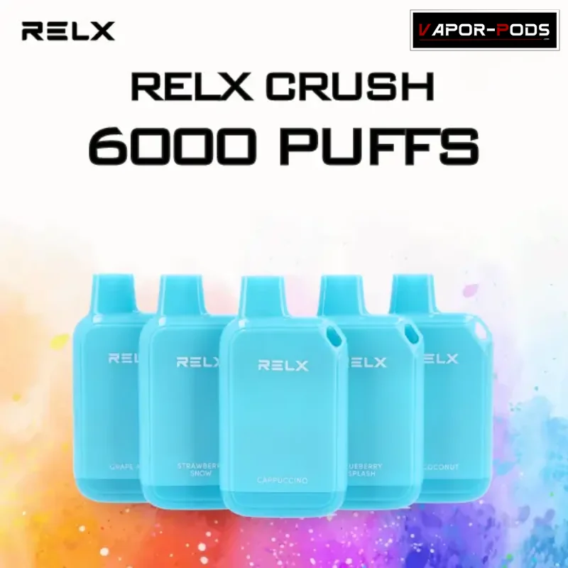 | กลิ่น RELX Crush 6000 puffs | Blueberry Splash, Cappuccino, Grape Apple, Icy Coconut, Icy Mineral Water, Peach Blue Raspberry, Strawberry Snow, Strawberry Watermelon, Triple Mango, Watermelon Chill |