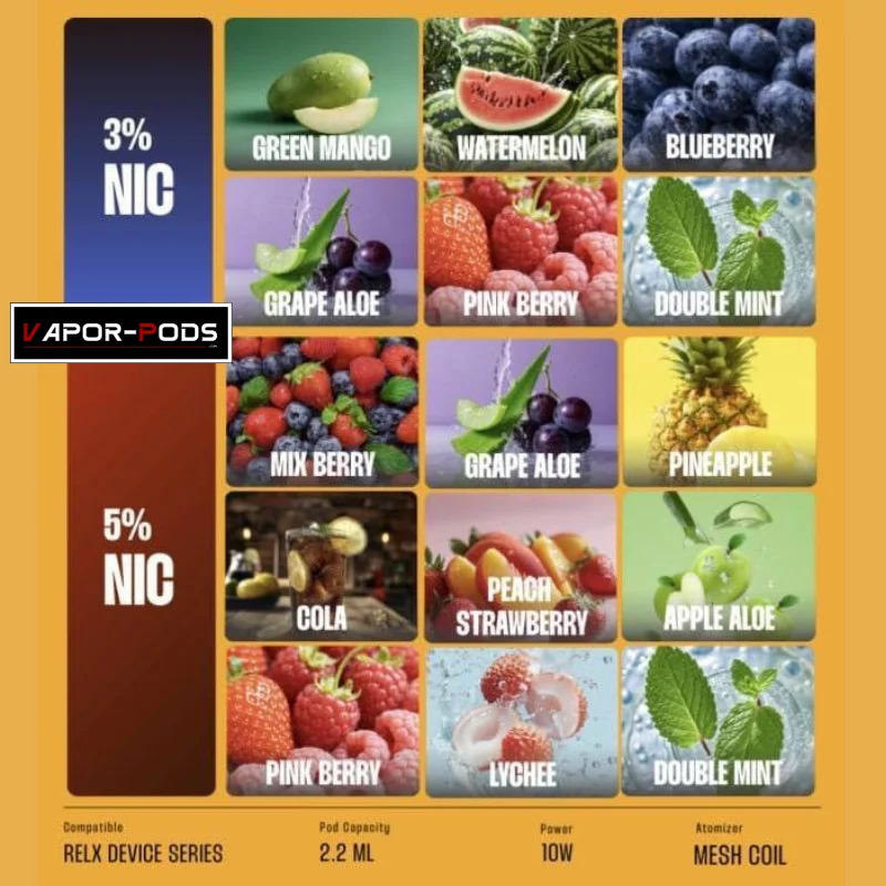 | กลิ่น หัว RELX Ultra Pod | Blueberry Nic3%, Grape Aloe Nic3%, Double Mint Nic3%, Green Mango Nic3%, Pink Berry Nic3%, Watermelon Nic3%, Cola Nic5%, Apple Aloe Nic5%, Double Mint Nic5%, Lychee Nic5%, Mixberry Nic5%, Grape Aloe Nic5%, Pineapple Nic5%, Peach Strawberry Nic5%, Pink Berry Nic5% |